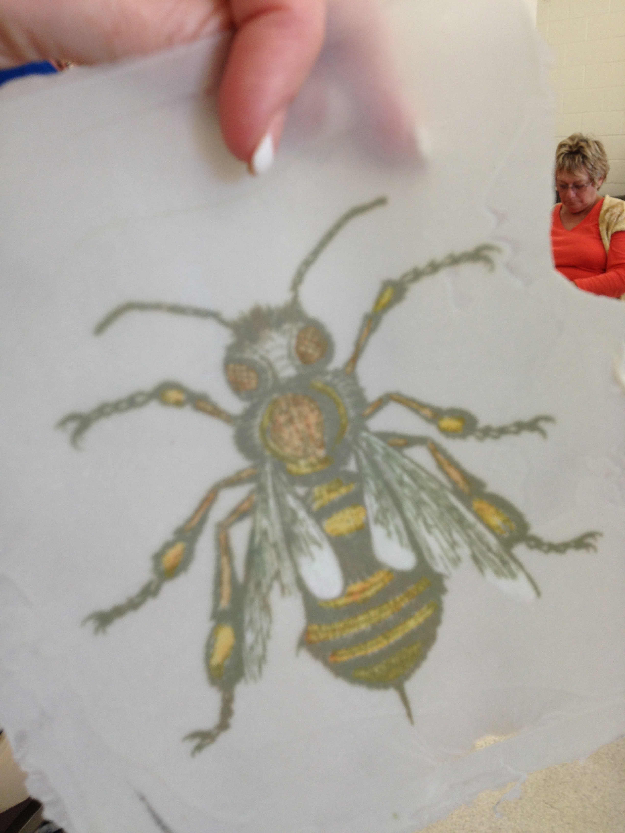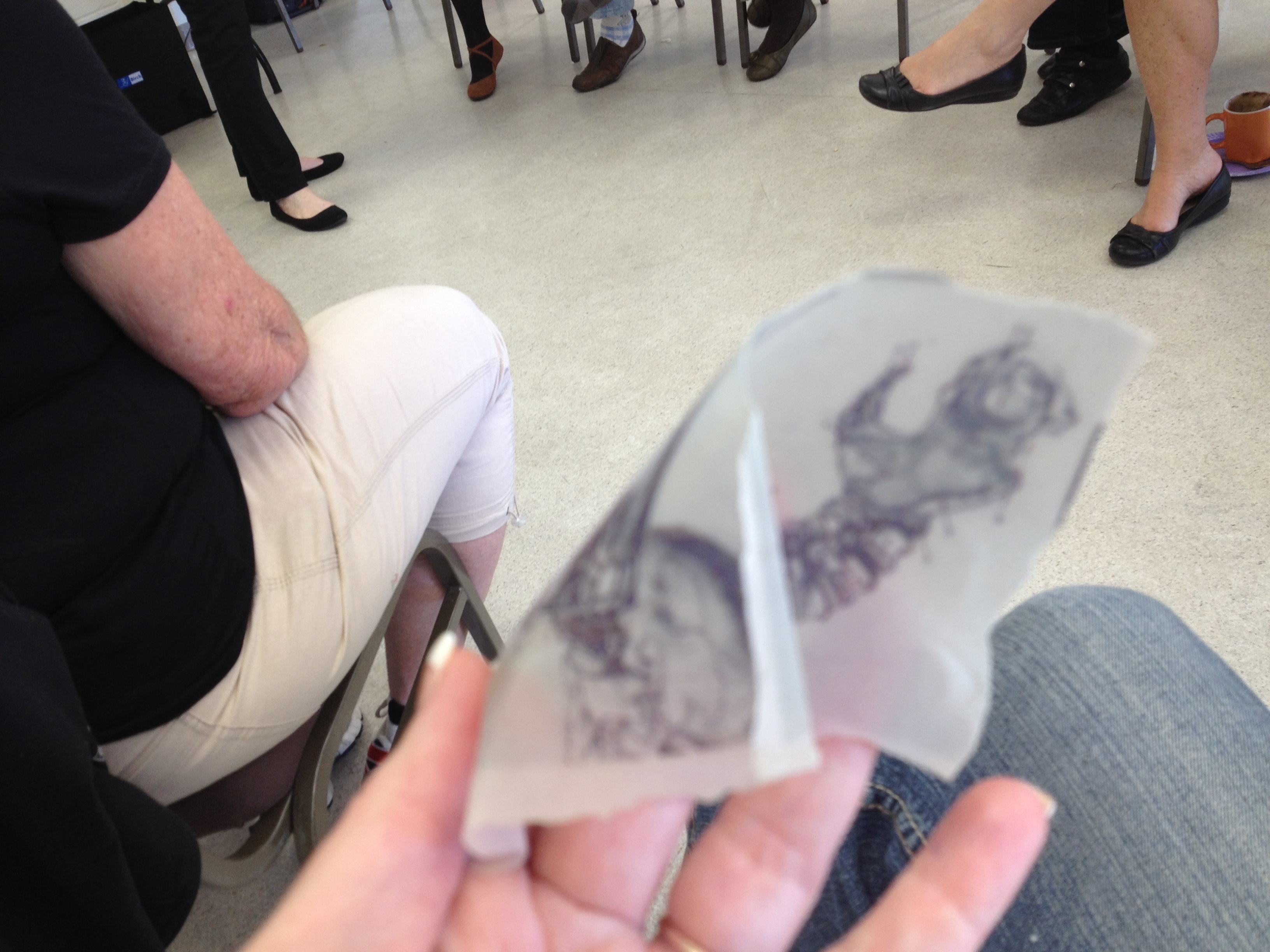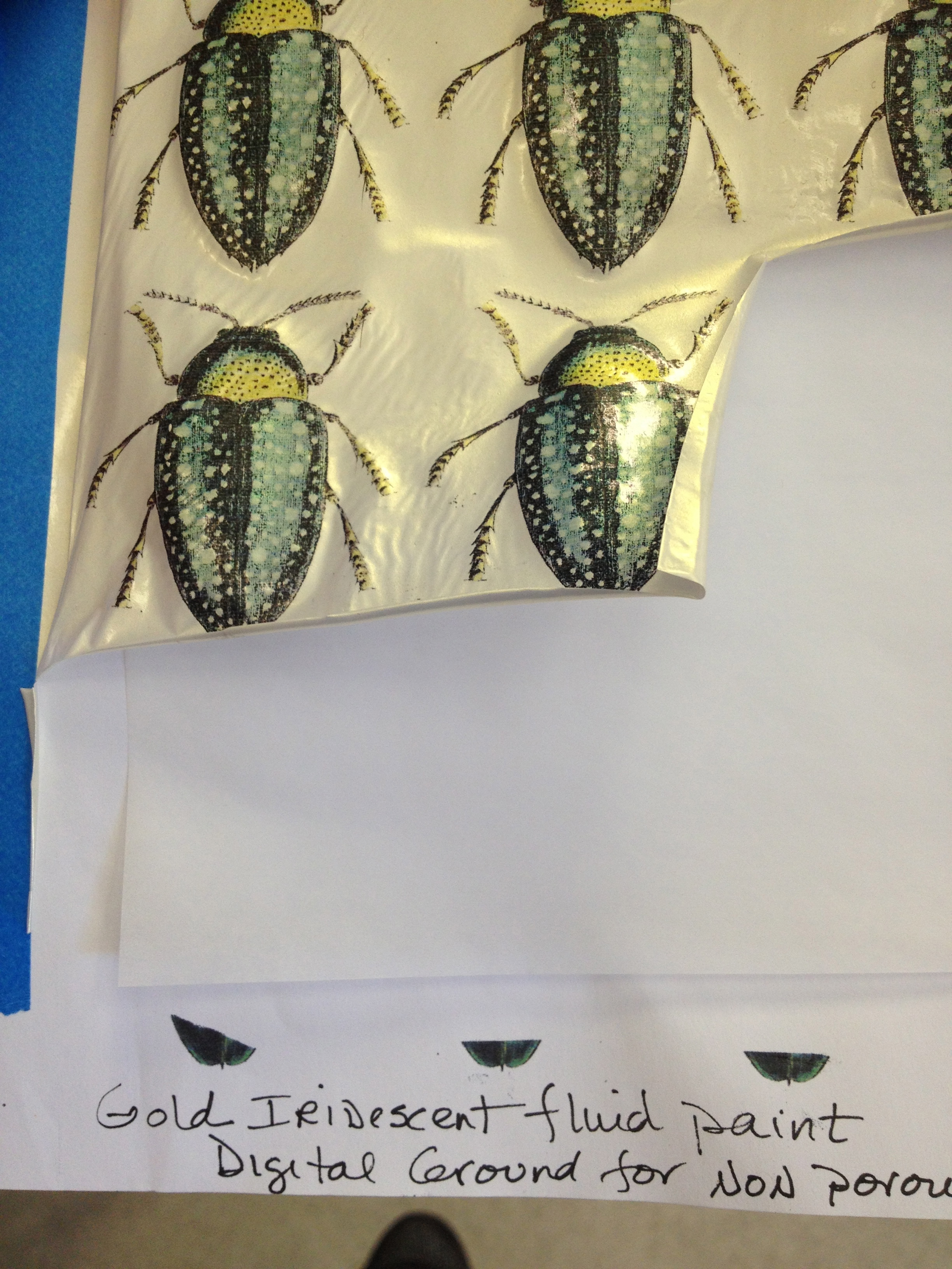 The products that related to my work involved “grounds” or digital grounds being painted onto plastic to create a base that could then be put through a printer. The grounds enabled the print media to stick to surfaces, like layers of acrylic paint, tin cans, aluminium foil, copper shim and all sorts of things you would never think of putting into the printer. Or the ground can be painted by itself and then printed, leaving a translucent layer that can be stitched or used. Below are some of the demo items that Nancy Stockman from Golden Products had to show.