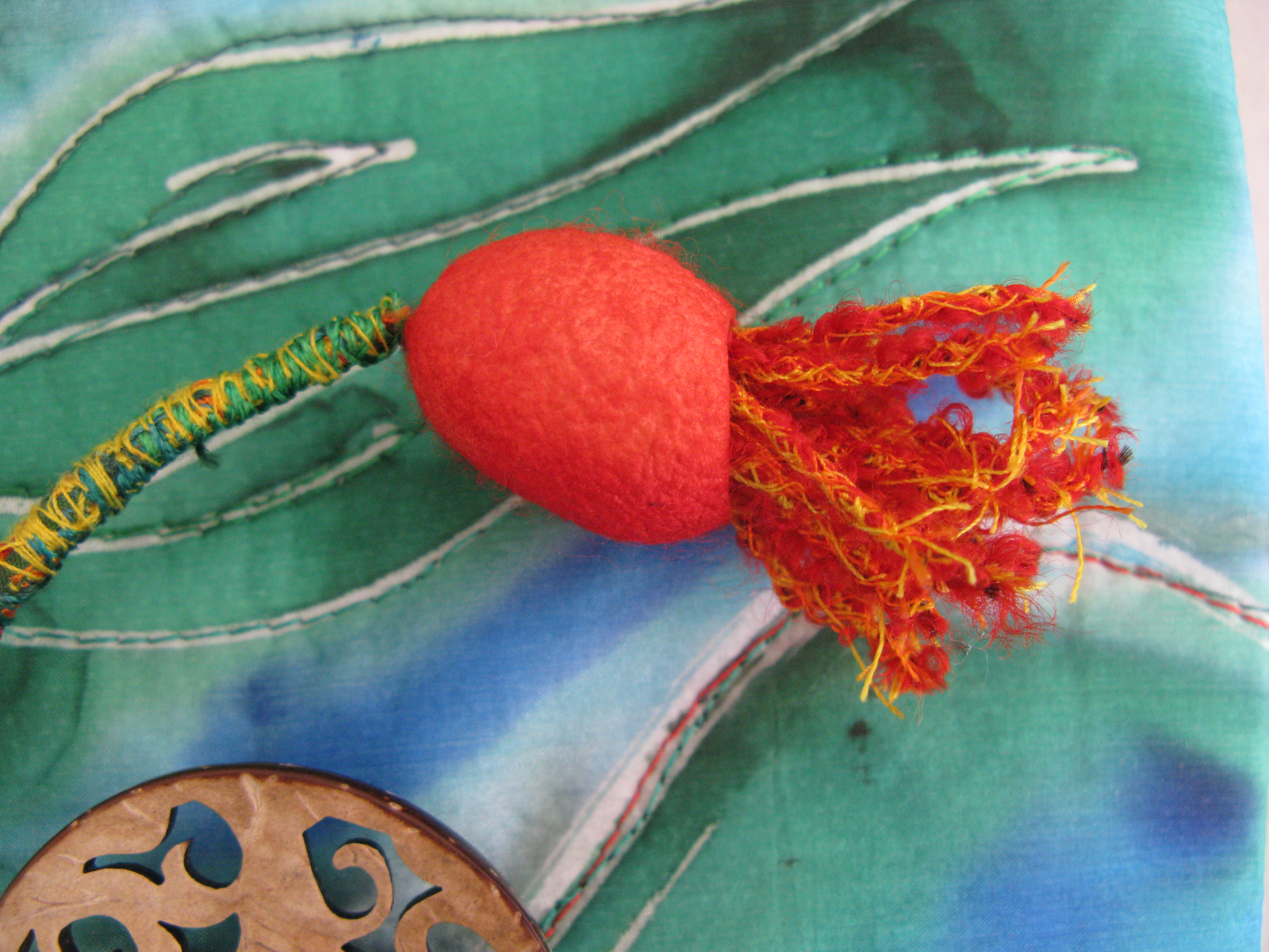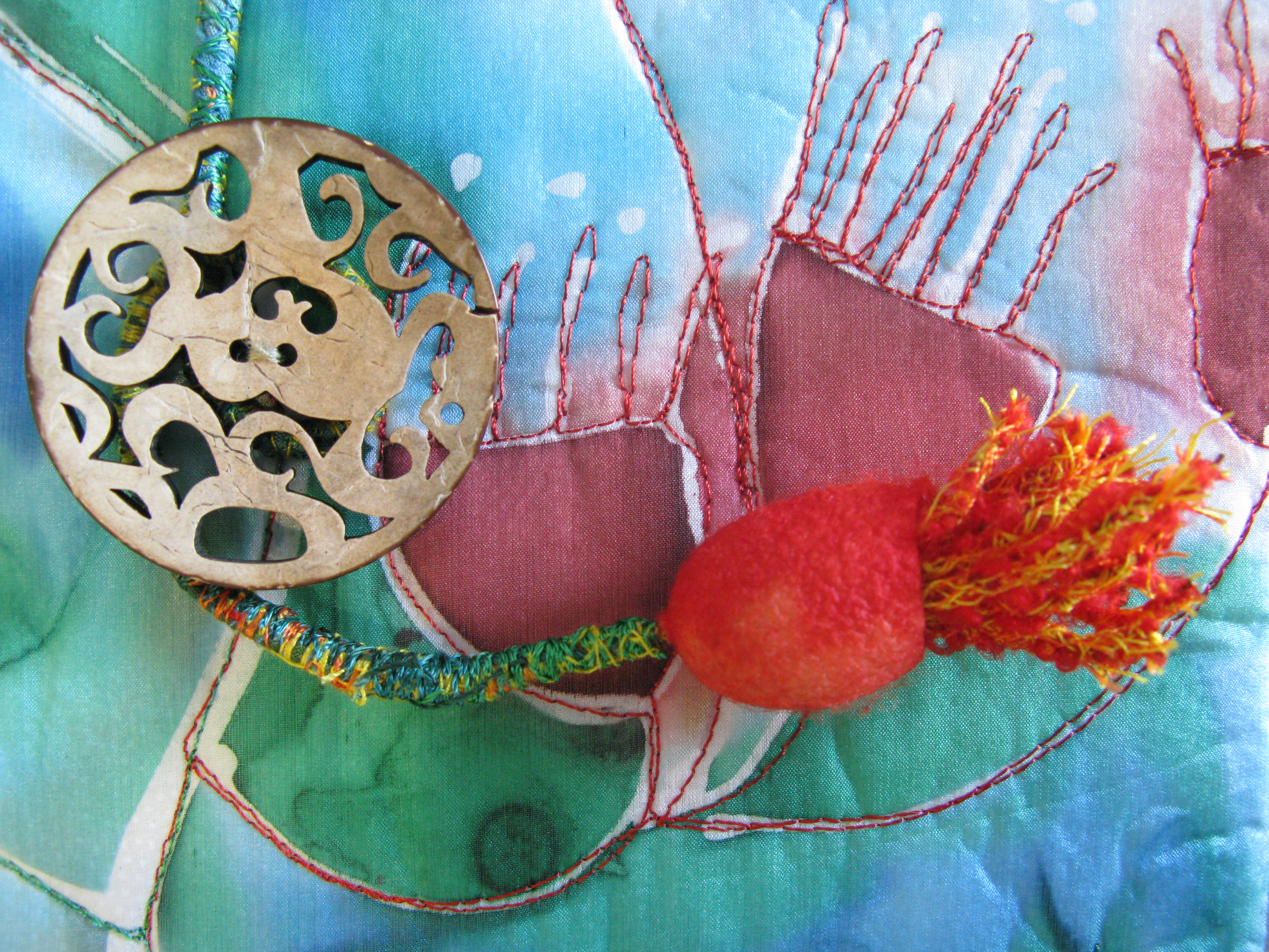 Thinking that the fluidity of the silk colours and the Australiana theme might appeal, I stitched the silk to batting, added a wrapped cord and hand dyed silk cocoon and used a favourite coconut shell button (that I bought in Adelaide from the most fabulous button shop that I have ever been into!)