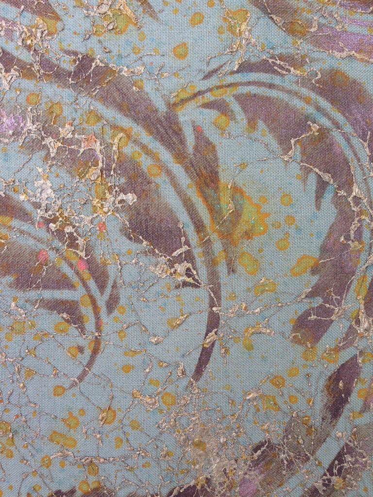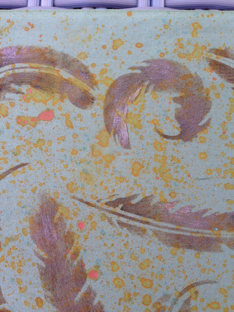 I started with a khaki green base fabric and used a feather stencil and acrylic inks applied lightly with a sponge.
