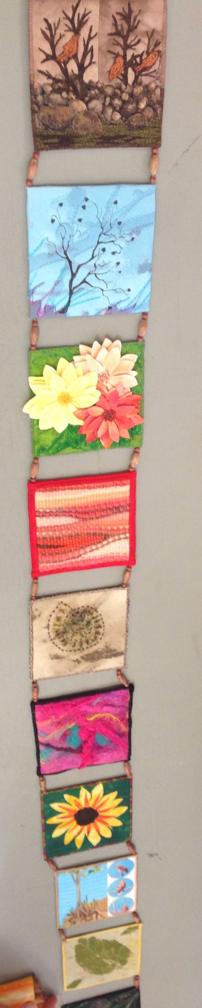and as exhibitions and all things stressful are never a success unless you have a wonderful organiser at the helm we gave our Chief Organiser a Thank you.  We decided that we would create a piece reminiscent of our exhibition pieces, which were along the lines of Nature’s Threads, and the dimension would be 4 x 4 inches this time… hence Finchies were born! Sue Joined them all together with beads as separators to form a hanging.