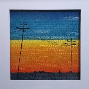 Alison Charlton’s topics were local crops depicted in Shibori. Kim Boland chose to represent the local crops in an abstract applique fashion. Sue Duffy Created the local birdlife and Di Flint’s couching was superb in her local landscapes. I chose to portray local sunsets which I found via social media. Full permission was sought from the photograph owners which was a wonderful experience in itself!