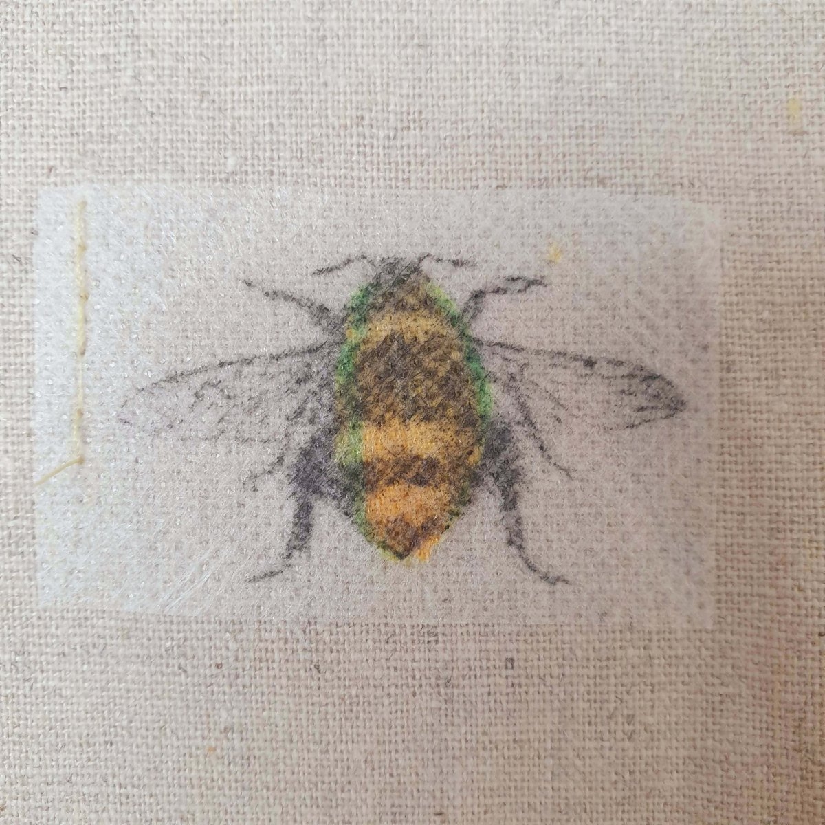 The printed bee together with the applique applied to the fabric project. Fabric Solvy is sticky