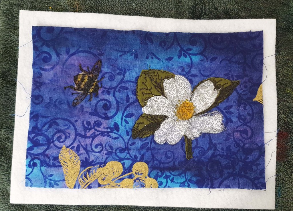 Printable Sticky Fabri-Solvy Stitchables are amazing. I forgot that I had a roll in my studio and when I got called upon to donate a piece into a local fundraiser, I found an artquilt that needed attention…. and decided that images printed onto the Sulky Fabri-solvy was just the right answer… and as I had to do a demonstration at the event, I thought what better to demonstrate… So I printed and created this fabulous flower and bee image that I may turn into a postcard or a journal cover.