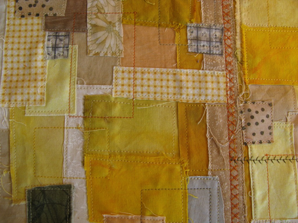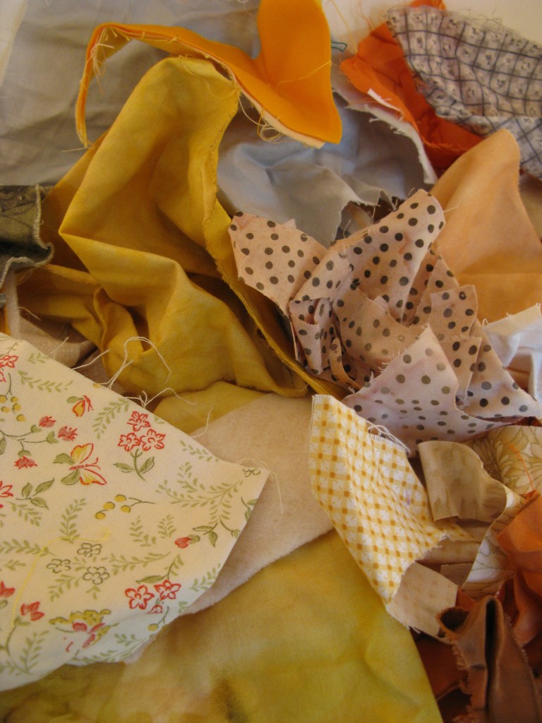 Select fabrics from your scrap bin that will not compete with the thread sketch.  Simple or subtle fabrics are good, but don’t be afraid to throw in a zinger fabric for interest. Perhaps you could use hand dyes or your dye mop up cloth if you have one lurking about.