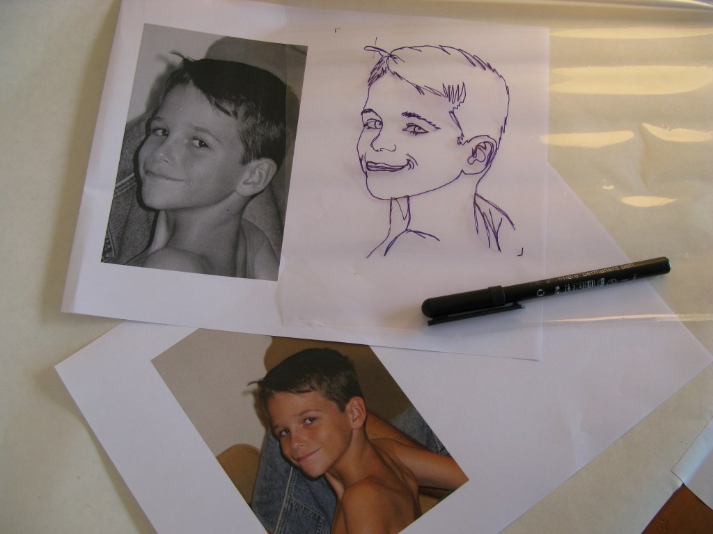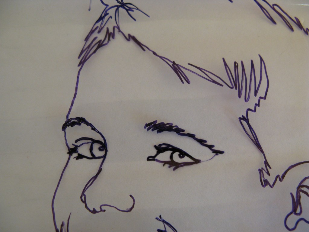 Using plastic such as overhead transparencies, plastic pockets, or non-adhesive book cover plastic. (Found in a roll at most Newsagents or Supermarkets). Trace the portrait with a thin black permanent marker.  Try not to lift the pen off the paper to imitate your actions in stitch.  In this Doodle Portrait there are only two stops-starts, one for the right eye and brow.  The remainder of the portrait was traced in one pen movement. When Drawing, as in stitching, some lines will be gone over more than once, however it is best to keep a single pass on the jaw, nose and cheek lines, unless the portrait is of an older person.