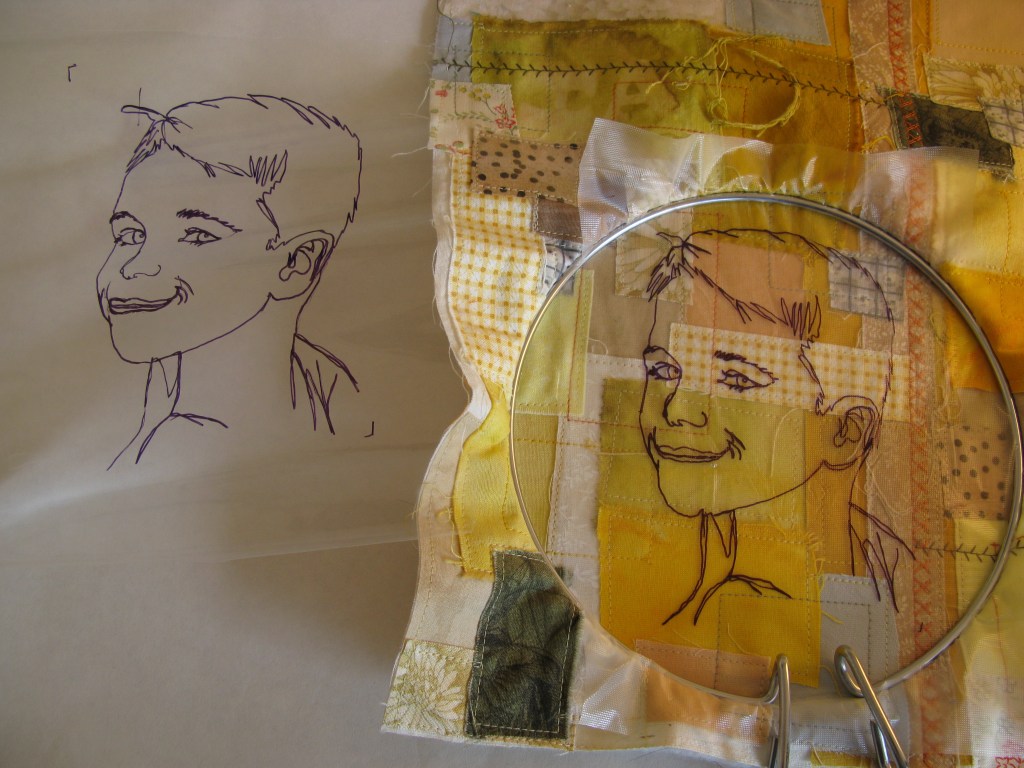 Roughly cut the fabrics to make a background for your sketch.  Affix them to an adhesive backing such as interfacing or calico with iron on interfacing.  Raw “fresh” edges with fabrics overlapping add interest to the piece.  Stitch the fabrics down using subtle colours and relaxed stitching.  Add interest with bolder coloured thread that matches the deeper fabric colours.  Use “off the grid stitching” or preset stitches on your machine.  Leave the portrait area of the background reasonably clear so that it doesn’t interfere with the portrait’s details.