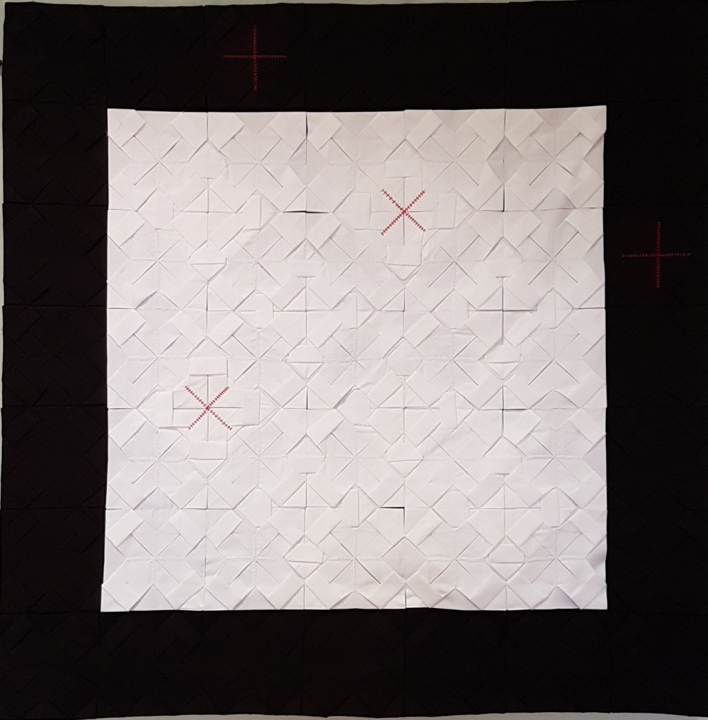 I had decided that just white would be an impressive segway.. but to pull it off I had to add texture. So I looked at all sorts of texture and ended up doing origami folds. I had to devise one that left no raw edges. I was really impressed with it (which doesn’t happen often). Then my husband said, I should put it into the AQC challenge. It needed to be 90 x 90cm so I quickly discounted that idea, but then I thought about the history of Origami, it’s practical & decorative uses and then I read the story of the 1000 cranes by the Hiroshima victim. My children have been to Japan, and each time they took 1000 paper cranes. I then realised that this one story had such a huge impact worldwide that it had broken borders and mended emotional bridges around the world. I had a chance now. The topic was related to the quilt. I added another row of folded blocks to bring it up to size, this time in Black surrounding the white. I applied 2 crosses in red stitching and wrote the story of how nothing is ever black and white, even in war and how an ancient technique has carried through the ages to people of all walks of life and has become a recognisable symbol of peace. It didn’t win of course, but I love that I conquered the challenge by being about to think outside the square… and that the title has 2 meanings, which leads me to art statements. But that’s a whole other article!