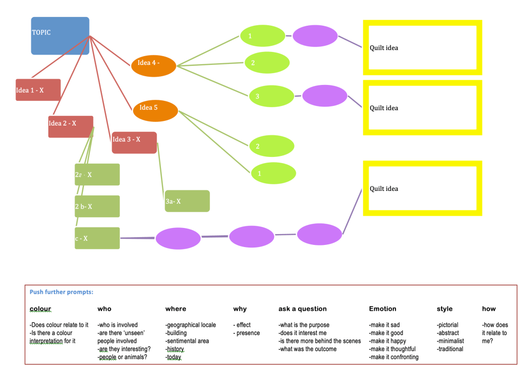 For example: With a main topic of HOME – my 1st 3 ideas are (HOUSE, BIRD HOUSE, HEART) to push past those and think outside the square either think of more ideas like (country, area of birth, family) or expand the ideas past at least 3 differentiations to reach a quilt idea