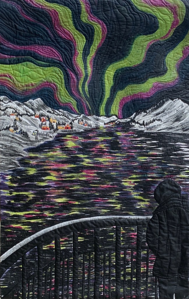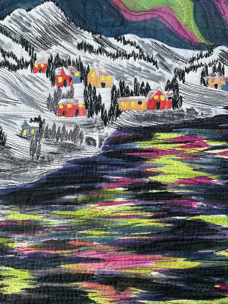 | Northern Lights | Painted onto cotton using fabric paints. Heavily free motion stitched. | Early this year, shortly before Lockdown, my son and I went on a magical trip through the fjords to north Norway, way above the Arctic Circle. We were lucky enough to see the Northern Lights together. I have thought about this time throughout Lockdown and, if I had a magic carpet, would go back there. |