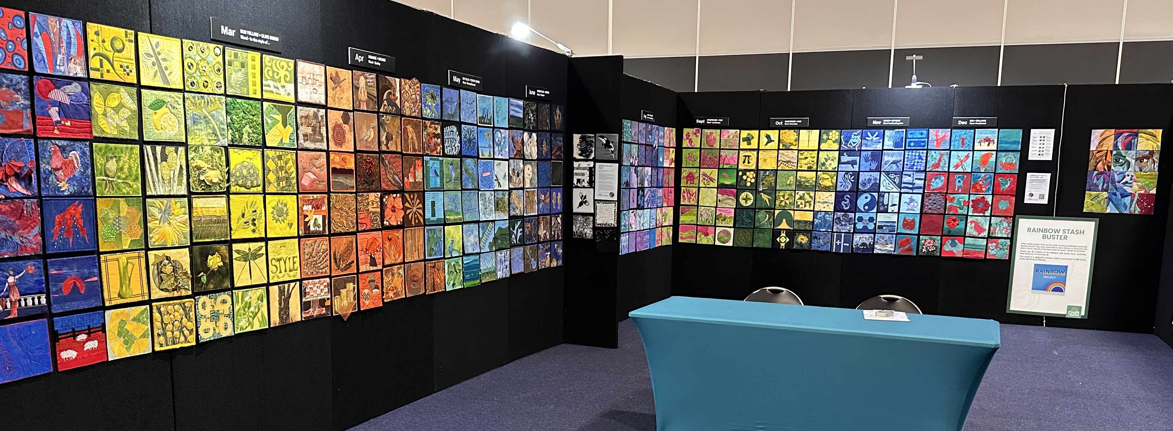 The display was a riot of colour and creativity — visitors walked along the walls in awe, soaking in the sheer impact of seeing so many works hung together in a rainbow sweep. People had fun tracing the series from each maker, spotting how their chosen colours shifted across the months, and delighting in the clever ways some incorporated the optional word prompts.