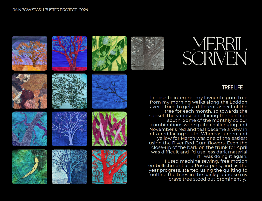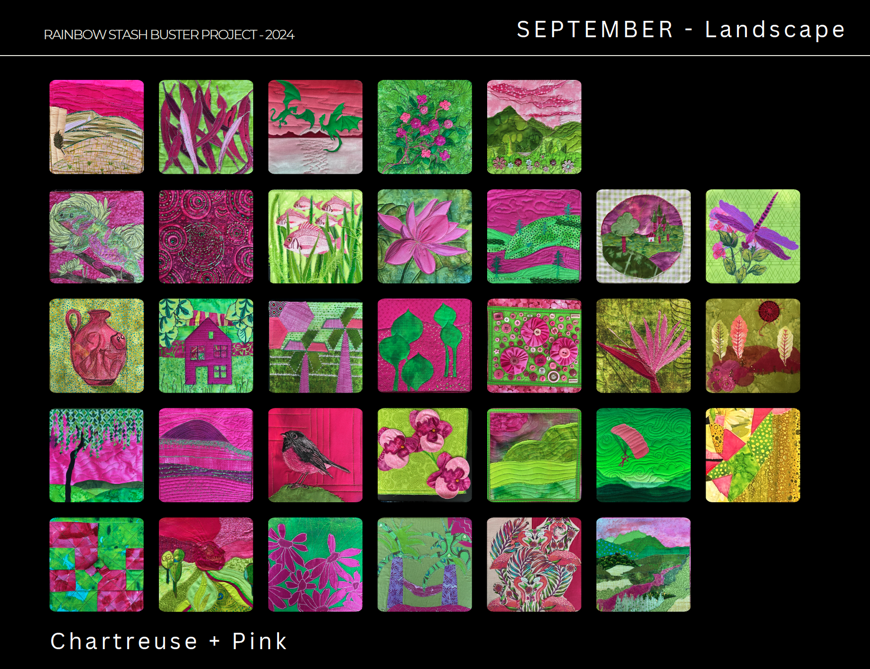 Earlier this year, participants created monthly textile art squares using colour prompts. The end result: a stunning array of mini-quilts that reflect each maker’s personality and creative voice. (You can read more about the challenge itself in our original announcement.)
